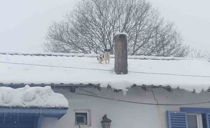 Bilecik’in Pazaryeri ilçesine bağlı Gümüşdere köyünde, yoğun kar yağışı sırasında bir evin çatısına çıkan minik köpek mahsur kaldı.