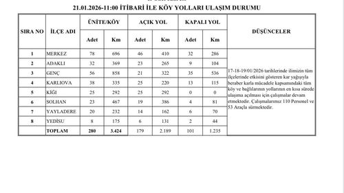 Bingöl İl Özel İdaresi ekipleri, 110 personel ve 53 araçla 179 köy yolunu ulaşıma açtı; 101 köy yolunda çalışmalar devam ediyor.