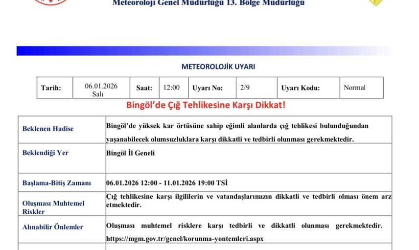 Meteoroloji 13. Bölge Müdürlüğü, Bingöl için çığ uyarısında bulundu.