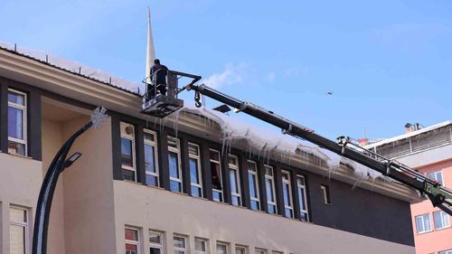 Bingöl'de oluşan metrelerce uzunluktaki buz sarkıtları, Bingöl Belediyesi ve İtfaiye Müdürlüğü ekipleri tarafından okullar ve kamu binalarından temizlendi.