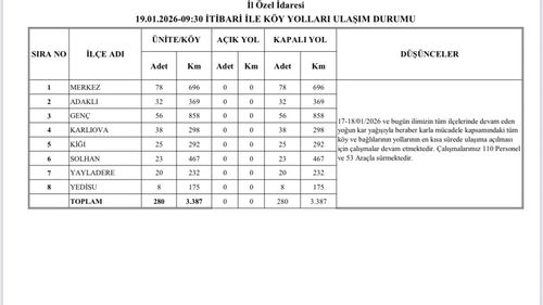Bingöl'de dün gece başlayan yoğun kar nedeniyle il genelindeki tüm 280 köy yolunun ulaşımı kesildi; İl Özel İdaresi ekipleri 110 personel ve 53 araçla çalışmalarını sürdürüyor.