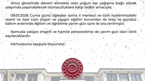 Bingöl'de yoğun kar yağışı nedeniyle 09.01.2026 Cuma öğleden sonra eğitime yarım gün ara verildi; engelli ve hamile kamu personeli izinli.