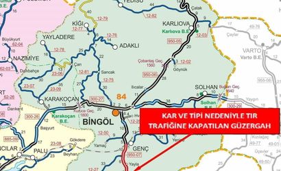 "Bingöl-Diyarbakır Devlet Yolunun 0-31 km’leri arası kar yağışı ve tipi nedeniyle (Genç ilçe girişi ile Diyarbakır il sınırı arası) saat 10.15 itibarıyla tır trafiğine kapatılmıştır" denildi.