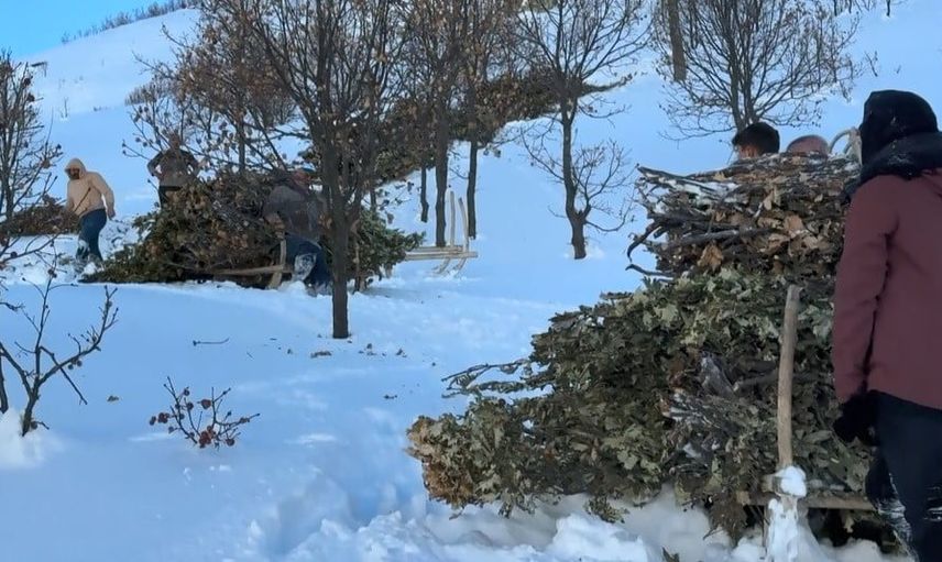 Yazın hazırlanan meşe dalları, karlı ve engebeli arazilerde kızaklara yükleniyor ve köylüler tarafından hayvan barınaklarına kadar çekiliyor. Bu yöntem, bölgede yıllardır uygulanan geleneksel çözüm olarak öne çıkıyor.