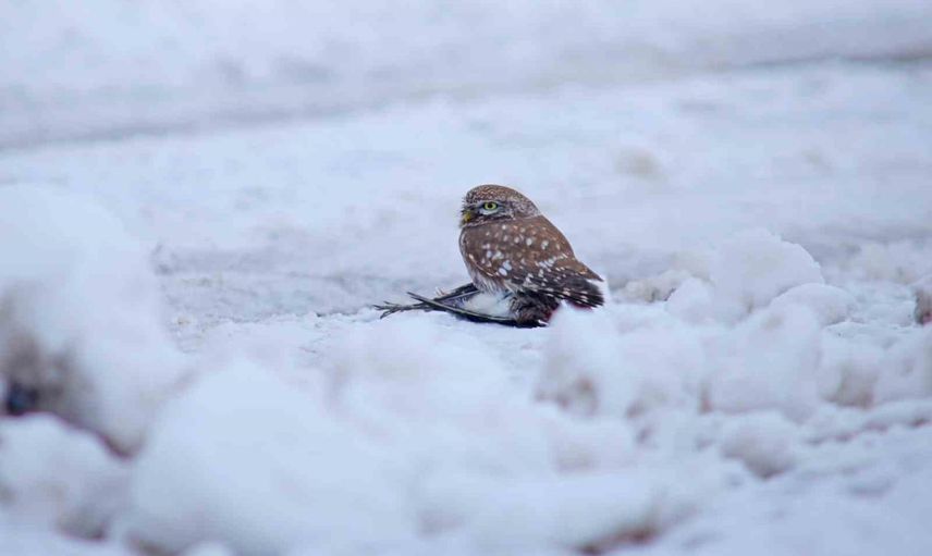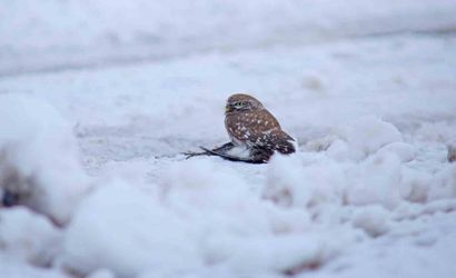 NORMALDE GECE AKTİF OLAN KUKUMAVIN, GÜNDÜZ SAATLERİNDE KARLA KAPLI ARAZİDE SU ÇULLUĞU İLE BİRLİKTE GÖRÜNTÜLENDİĞİ GÖRÜLDÜ.