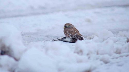 Bitlis'in Güroymak ilçesinde yoğun kar ve dondurucu soğuk, kukumavın gündüz su çulluğunu avlamasına yol açtı; nadir görüntüler doğanın zorlu koşullarını gösterdi.