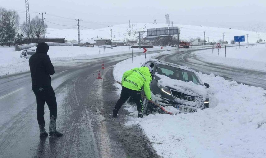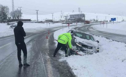 İl Emniyet Müdürlüğü’ne bağlı Trafik Tescil Şube Müdürlüğü ekipleri, kara saplanan otomobillerin önündeki karları kar kürekleri ile temizleyerek araçları çıkardı ve sürücülere yardımcı oldu.