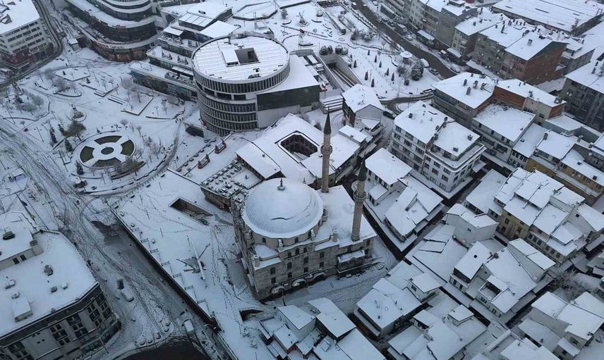 Şehrin ‘beyaz gelinliğini’ giymiş hali ve beyaza bürünen simge noktalar dron ile havadan görüntülendi. Dron kayıtları, kentin karla kaplı siluetini gözler önüne serdi.