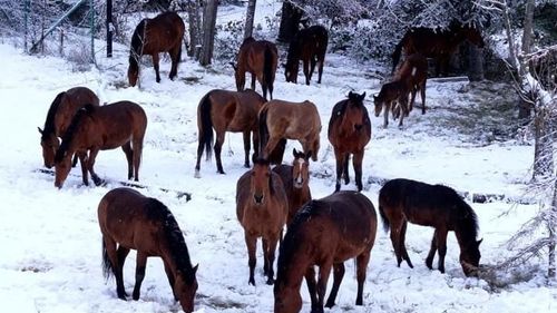 Bolu'da kar yağışı nedeniyle yiyecek bulamayan yılkı atları şehir merkezine inip eski Güzel Sanatlar Lisesi bahçesine girdi; belediye ekipleri samanla besledi.