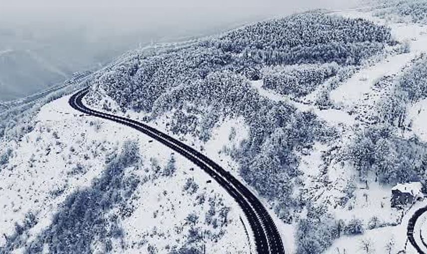 Çam ağaçlarının beyaz örtüyle bütünleştiği ve iki ana ulaşım aksının aynı karede yer aldığı anlar, dron ve havadan çekimler ile kayda alındı.