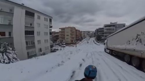 Bursa'nın Mudanya ilçesinde dün etkili kar yağışı sonrası bir vatandaş kayak takıp sokaklarda kayarak işe gitti; görüntüler sosyal medyada ilgi gördü.
