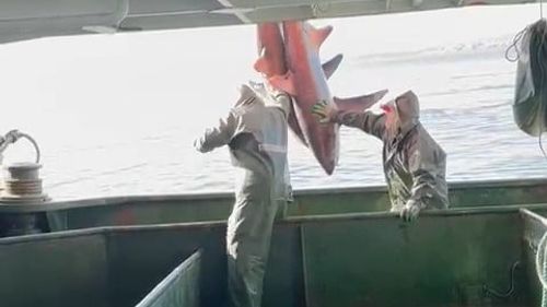 Gelibolu açıklarında Çalı Balıkçılık’ın ağlarına takılan 2 kamçı kuyruk cinsi köpek balığı, balıkçılar tarafından ağdan çıkarılıp denize geri bırakıldı.