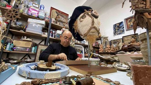 Çeşme'de 33 yıl esnaflık yapan 64 yaşındaki Nihat Atagöz, sahilden topladığı odun, taş ve metal atıkları sanata dönüştürerek eserlerini dünyaya gönderiyor.