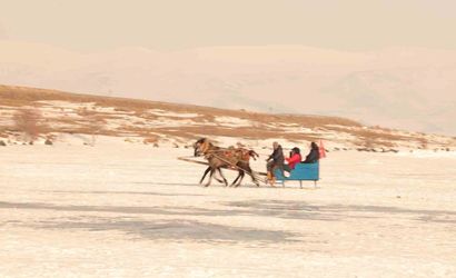 Doğu Anadolu Bölgesi’nin ikinci büyük gölü olan Çıldır Gölü’nün yüzeyi, soğuk havalar nedeniyle 20 santimetre kalınlığında buzla kaplandı. Bu durum, gölü ziyaret edenlerin en büyük eğlencesi haline gelen atlı kızak deneyimini de beraberinde getirdi.
