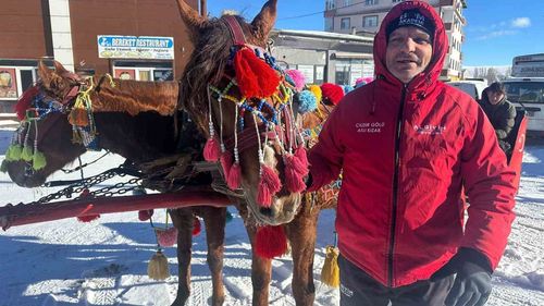 Donan Çıldır Gölü'nde atlı kızaklar ve atlar süslenerek yeni sezona hazırlandı; atlı kızak sahibi Soner Topkaya ziyaretçilere davet etti.