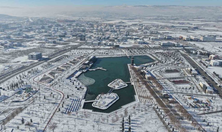 Parkın ağaçları, yürüyüş yolları ve yeşil alanları karla kaplanırken, bu anlar dron ile görüntülendi. Ortaya çıkan kareler kartpostalları aratmadı.