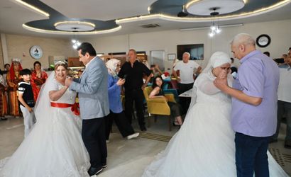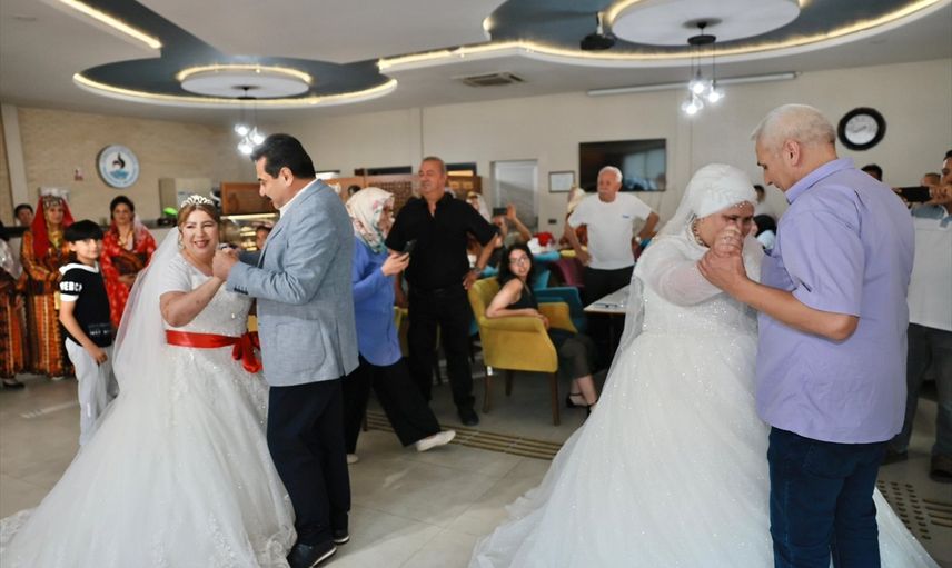 Mahalle kuaförü tarafından saç ve makyajları yapılan Gülizar Kızılhan (35) ve Selma Erfidan (42), gelinliklerini giyerek düğün salonuna doğru yola çıktılar. Pamukkale Belediye Başkanı Ali Rıza Ertemur, gelin adaylarını ellerinden tutarak salona getirdi.