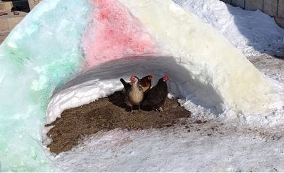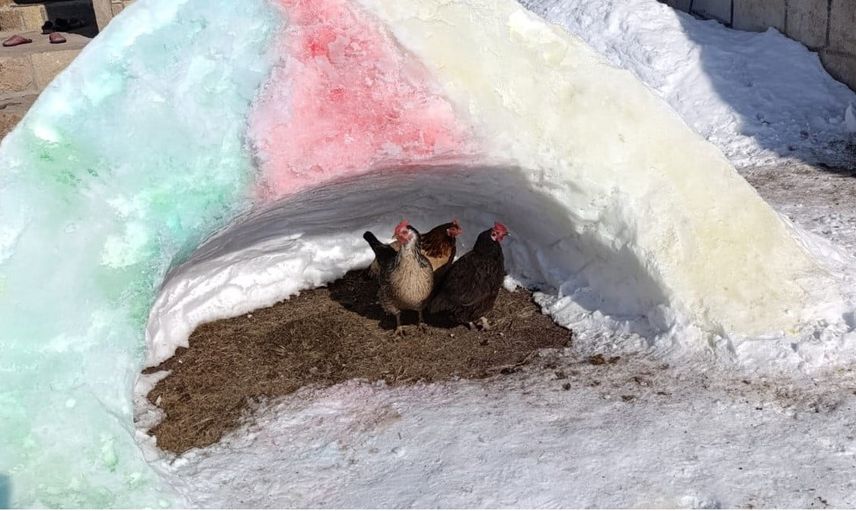 Vatandaşlar tarafından yapılan kardan barınaklar, hayvanlar için adeta sığınak oldu. Özenle hazırlanan kar tünellerinin içinde tavuklar ve bir kedi güvenle barınırken, barınakların zeminine serilen saman hayvanların soğuktan korunmasını sağladı.
