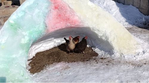 Ağrı’nın Diyadin ilçesinde vatandaşlar, yoğun kar ve dondurucu soğuklarda sokak hayvanları için kardan barınaklar yaparak tavuk ve kedileri korudu.