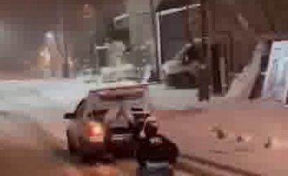 O anlar, gençlerin arkadaşının da bagaj kısmına oturmasıyla kayıt altına alındı. Aracın bağlı lastik üzerinde kayan genç, sokaktan geçerken arkadaşlarının kartopu sürpriziyle karşılaştı.
