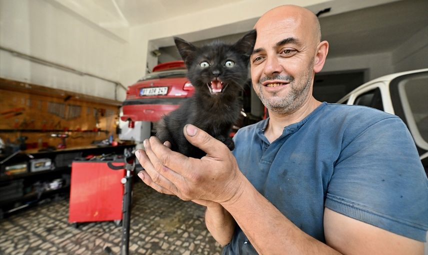 Motorundan çıkarılan yavru kedi, usta Mümin Ataseven tarafından sahiplenildi