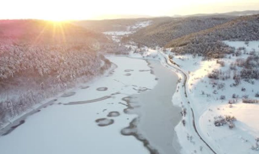 Buz tutan göletler, çevrelerindeki kar örtüsüyle birlikte dron ile görüntülendi ve havadan kaydedilen sahneler kartpostallık manzaralar sundu.