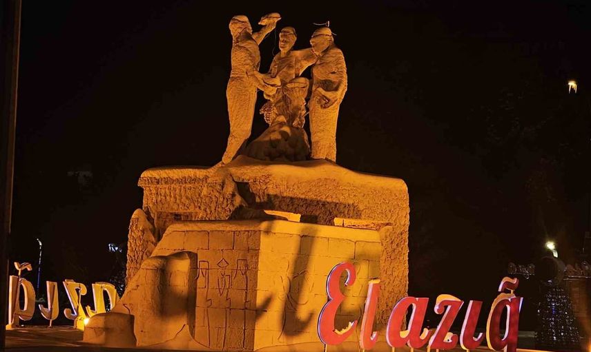 Kent beyaza bürünürken, kavşakta bulunan; Elazığ’ın tüm ilçelerinin isimlerinin yer aldığı ve kentin simgesi olan Çaydaçıra efsanesini temsil eden heykel karla kaplanan manzarada öne çıktı.