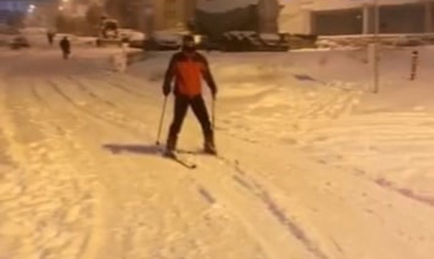 ELAZIĞ’DA BİR VATANDAŞ, YAĞAN KAR SONRASI KAYAK TAKIMIYLA CADDEDE GEZDİ