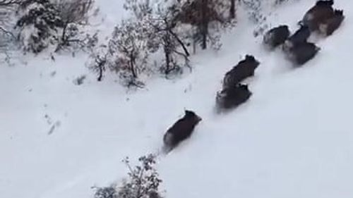 Elazığ’ın Ağın ilçesinde ağaçlık alandaki domuz sürüsünün kaçış anları, vatandaşın dronuyla Keban Baraj Gölü'nün üst kısmında karlar arasında görüntülendi.