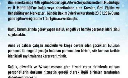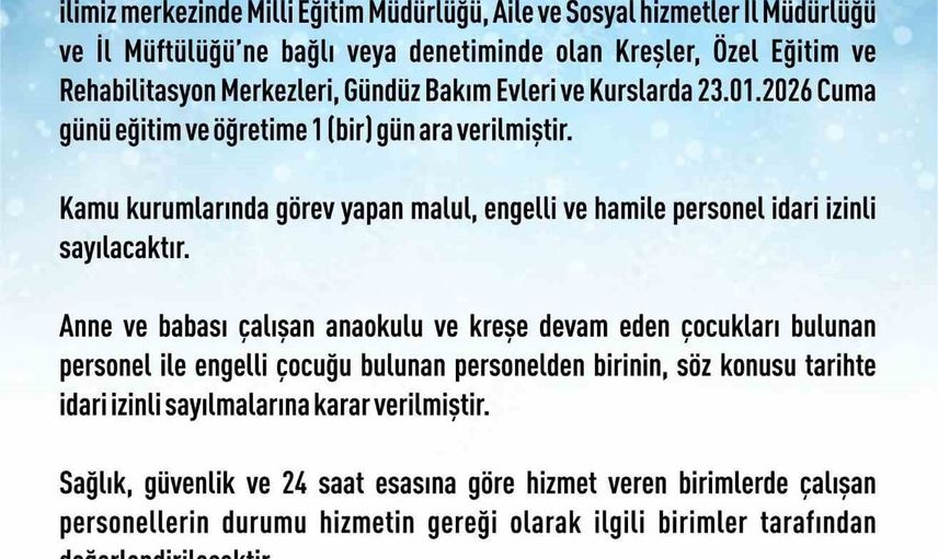 "Kar yağışının gece boyu ve yarın akşama kadar süreceği değerlendirildiğinden ilimiz merkezinde Milli Eğitim Müdürlüğü, Aile ve Sosyal hizmetler İl Müdürlüğü ve İl Müftülüğü’ne bağlı veya denetiminde olan kreşler, özel eğitim ve rehabilitasyon merkezleri, gündüz bakım evleri ve kurslarda Cuma günü eğitim ve öğretime 1 (bir) gün ara verilmiştir. Kamu kurumlarında görev yapan malul, engelli ve hamile personel idari izinli sayılacaktır. Anne ve babası çalışan anaokulu ve kreşe devam eden çocukları bulunan personel ile engelli çocuğu bulunan personelden birinin, söz konusu tarihte idari izinli sayılmalarına karar verilmiştir. Sağlık, güvenlik ve 24 saat esasına göre hizmet veren birimlerde çalışan personellerin durumu hizmetin gereği olarak ilgili birimler tarafından değerlendirilecektir. İlçelerde ise Kaymakamlar tarafından karar verilecektir"