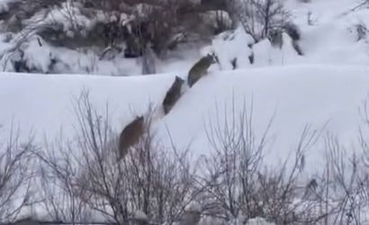 Karlar arasında yürüyen sürü, bir vatandaşın cep telefonu kamerasına yansıdı. Görüntülerde kurtların bölgeyi taradığı, kısa süre sonra ise gözden kaybolduğu görüldü.