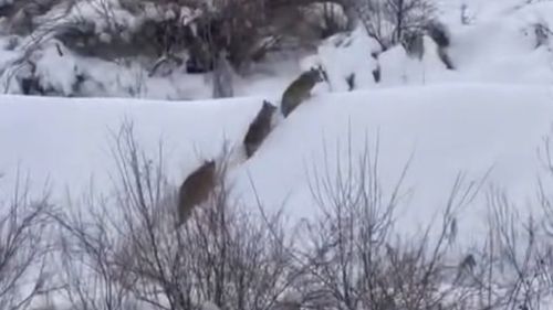 Elazığ’ın Gözeli köyü Tarlatepe mezrasında yiyecek arayan kurt sürüsü cep telefonu kamerasına yansıdı; karlar arasında yürüyen sürü bir süre sonra kayboldu.