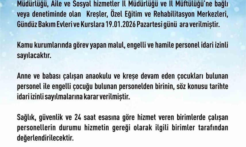Pazartesi günü için verilen ara; kreşler, özel eğitim ve rehabilitasyon merkezleri, gündüz bakım evleri ve kursları kapsıyor. Ayrıca malul, engelli ve hamile personel ile belirlenen koşullardaki çalışanlar idari izinli sayılacak.
