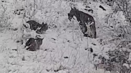 Elazığ’ın Karakoçan ilçesi Balcalı köyünde anne vaşak ve 2 yavrusu, avladıkları kekliği yerken Kenan Çavundur tarafından cep telefonuyla görüntülendi.