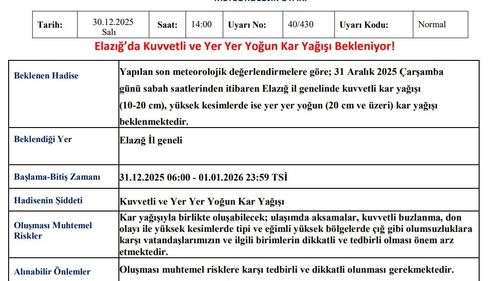 Meteoroloji 13. Bölge Müdürlüğü, 31 Aralık 2025'te Elazığ'da 10-20 cm; yüksek kesimlerde 20 cm ve üzeri yoğun kar beklendiğini, ulaşım ve çığ riskine karşı tedbir çağrısı yaptı.