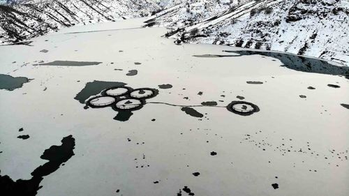 Erzincan Çatalarmut’taki Göyne Sulama Barajı, gece sıcaklıklarının sıfırın altında 20 dereceye kadar düşmesiyle yüzeyi buzla kaplandı; balık kafesleri de buz altında kaldı.