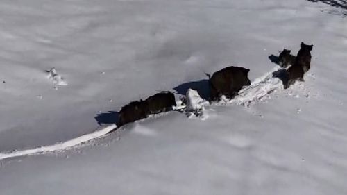 Erzincan'da Kalecik köyü yakınlarında karla kaplı arazide ilerleyen yaban domuzu sürüsü, vatandaş Murat Aydemir'in drone çekimleriyle görüntülendi.
