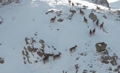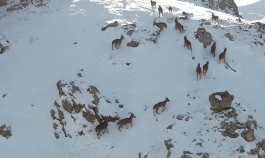 Erzincan sınırları içindeki Munzur Dağları'nda, karlı arazide yiyecek arayan dağ keçileri drone ile kaydedildi. Yaban hayatının zengin olduğu bölgede çekilen görüntüler, doğaseverlerin ilgisini çekti.