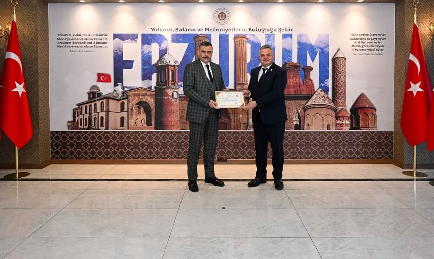 Erzurum Valisi Mustafa Çiftçi, çevre yatırımlarına sundukları destek nedeniyle DSİ 8. Bölge Müdürü Oğuzhan Yavuz ve Karayolları 12. Bölge Müdürü Fatih Günaydın'a başarı belgesi verdi.