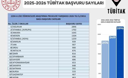 2025-2026 eğitim öğretim yılı kapsamında düzenlenen TÜBİTAK 2204-A Lise Öğrencileri Araştırma Projeleri Yarışması başvuru sonuçları açıklandı. Açıklanan verilere göre Erzurum, 2 bin 896 proje başvurusu ile Türkiye genelinde birinci sırada yer aldı.
