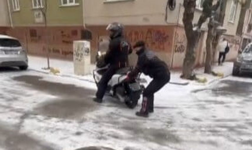Eskişehir'de bir kuryenin, başka bir kurye tarafından kullanılan motosikletin arkasına tutunup buzlu zeminde kaydığı anlar sosyal medyada büyük ilgi topladı.