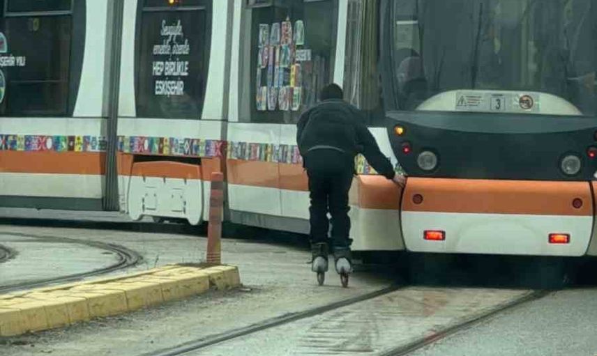 Eskişehir’de patenli bir çocuk, hareket halindeki tramvayın arkasına tutunarak riskli davranışlarda bulundu. Olay, Uluönder Mahallesi Erzurum Kongresi Caddesi’nde meydana geldi.