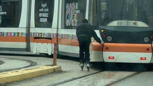 Eskişehir Uluönder Mahallesi'nde bir patenli çocuk, hareket halindeki tramvayın arkasına tutunarak tehlikeli hareketler yaptı; o anlar cep telefonu kamerasına yansıdı.
