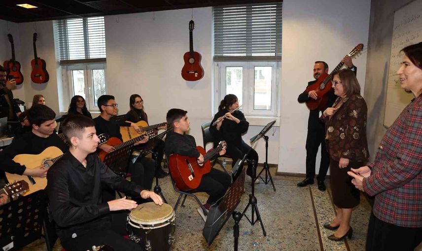 Atölyelerin sürdüğü Kahraman Emmioğlu Kültür ve Sanat Merkezinde çocukların piyano, keman ve resim eğitimlerini yakından izleyen Başkan Şahin, performansları takip etti ve öğrencilerle sohbet etti.