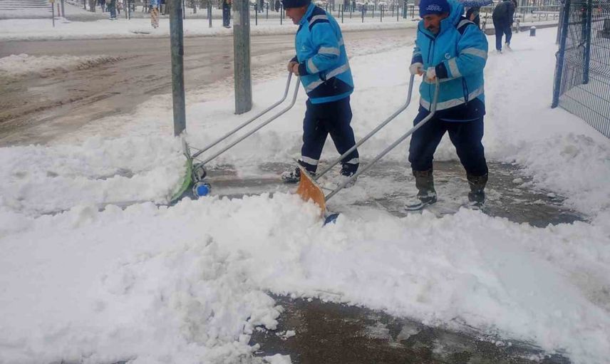 Büyükşehir ekipleri, ana arterlerde trafik güvenliğini sağlamak için yol temizleme çalışmalarını yürütürken; çarşı merkezleri, hastaneler, toplu kullanım alanları ve yaya yoğunluğunun yüksek olduğu bölgelerde kaldırımlarda biriken karları temizliyor.
