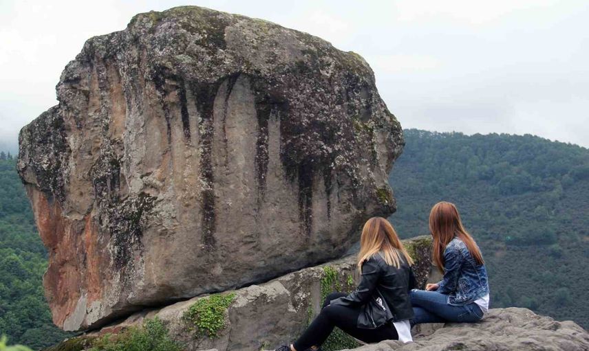 GİRESUN’DA TONLARCA AĞIRLIĞINDAKİ İKİ DEV KAYANIN, DİK YAMACA ADETA FİZİK KURALLARINA MEYDAN OKUYAN DURUŞUYLA DİKKAT ÇEKEN "GELİN KAYASI", EFSANELERİYLE DE ZİYARETÇİLERİN İLGİSİNİ ÇEKİYOR. BÖLGE, GİRESUN İL ÖZEL İDARESİ TARAFINDAN TURİZME KAZANDIRILIYOR.