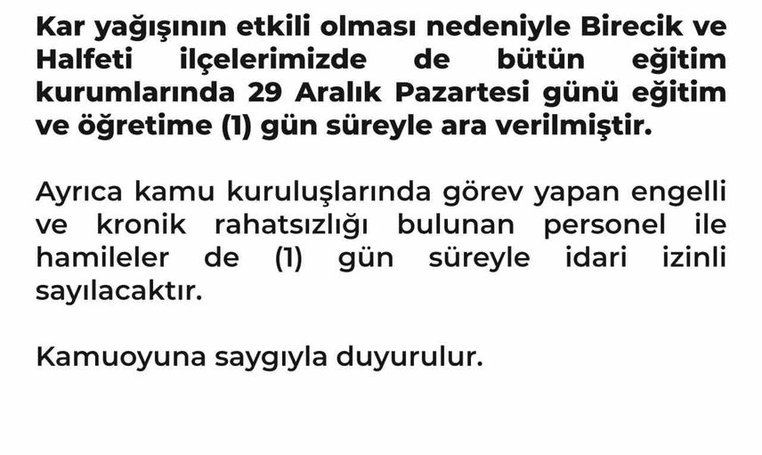 Sabaha karşı kar yağışının bu ilçelerde de yoğun bir şekilde görülmesi üzerine alınan yeni karar ile Halfeti ve Birecik'te de okullar bir günlüğüne tatil edildi.