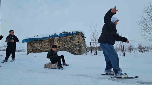Muş Hasköy'ün Dağdibi köyünde çocuklar, poşet, kızak ve el yapımı demir patenlerle yokuşlu yolları kayak pistine çevirerek karın tadını çıkardı.