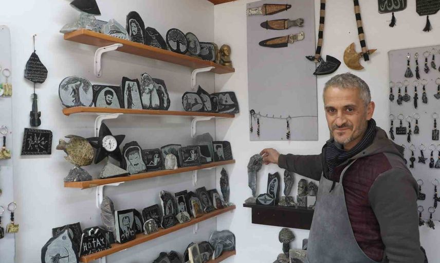 Hatay’da hobi olarak başladığı serpantin taşı işleme sanatını ekmek kapısına çeviren Ali Güler, 25 yıldır taş işçiliğiyle geçimini sağlıyor.