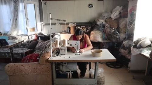Depremde evi yıkılan 41 yaşındaki Gülhan Hüzmeli, konteynerde el işi yaparak engelli eşi ve 4 çocuğuna bakıyor; ürünleri 100-300 TL arasında satıyor.